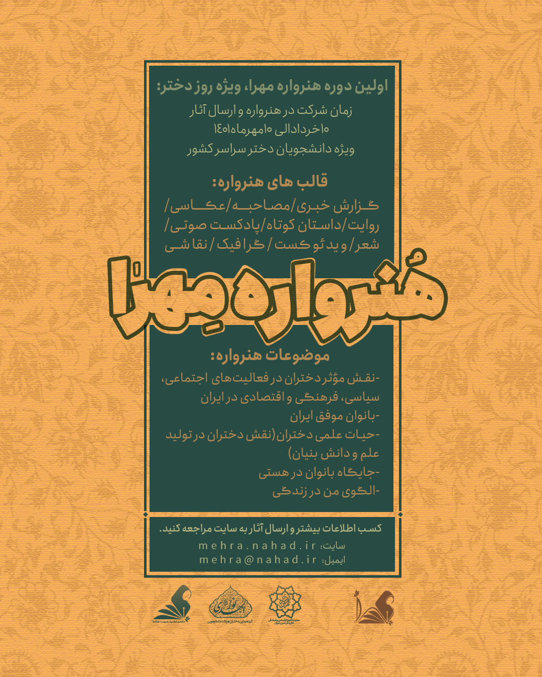 – ثبت نام و ارسال آثار از طریق سایت به آدرس الکترونیکی: mehra.nahad.ir خواهد بود.