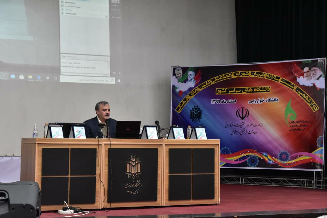 دوازدهمین نشست سالانه دبیران شورای هماهنگی کانون های فرهنگی دانشگاه های کشور روز چهارشنبه ۱۳ اسفند ماه در دانشگاه خوارزمی با حضور آقای دکتر غفاری معاون فرهنگی و اجتماعی وزارت علوم تحقیقات و فناوری، آقای دکتر حبیبی ریاست دانشگاه، آقای مهندس عسگری مدیر کل فرهنگی و اجتماعی وزارت علوم ، آقای دکتر شالچی معاون فرهنگی دانشگاه علامه طباطبایی ، معاون دفتر نهاد نمایندگی مقام معظم رهبری در دانشگاه حجت الاسلام و المسلمین علی محمدی ، کارشناسان فرهنگی و فعالان کانونهای فرهنگی و اجتماعی برگزار شد