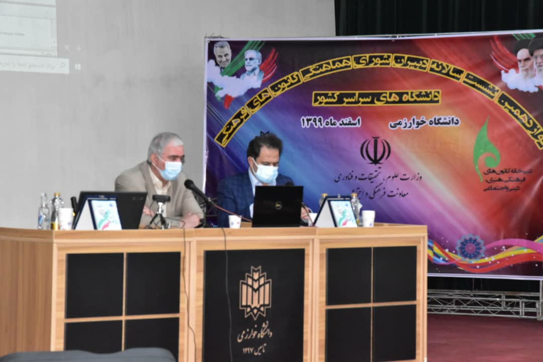 دوازدهمین نشست سالانه دبیران شورای هماهنگی کانون های فرهنگی دانشگاه های کشور روز چهارشنبه ۱۳ اسفند ماه در دانشگاه خوارزمی با حضور آقای دکتر غفاری معاون فرهنگی و اجتماعی وزارت علوم تحقیقات و فناوری، آقای دکتر حبیبی ریاست دانشگاه، آقای مهندس عسگری مدیر کل فرهنگی و اجتماعی وزارت علوم ، آقای دکتر شالچی معاون فرهنگی دانشگاه علامه طباطبایی ، معاون دفتر نهاد نمایندگی مقام معظم رهبری در دانشگاه حجت الاسلام و المسلمین علی محمدی ، کارشناسان فرهنگی و فعالان کانونهای فرهنگی و اجتماعی برگزار شد