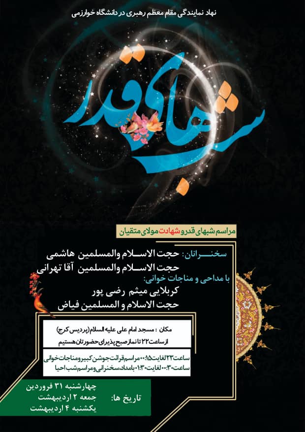 برگزاری مراسم شب های پر فیض قدر و قرائت دعای جوشن کبیر در مسجد دانشگاه (البرز) 06 اردیبهشت 1401اخبار نهاد رهبری واحد کرجبدون دیدگاهنهاد رهبری در دانشگاه خوارزمی