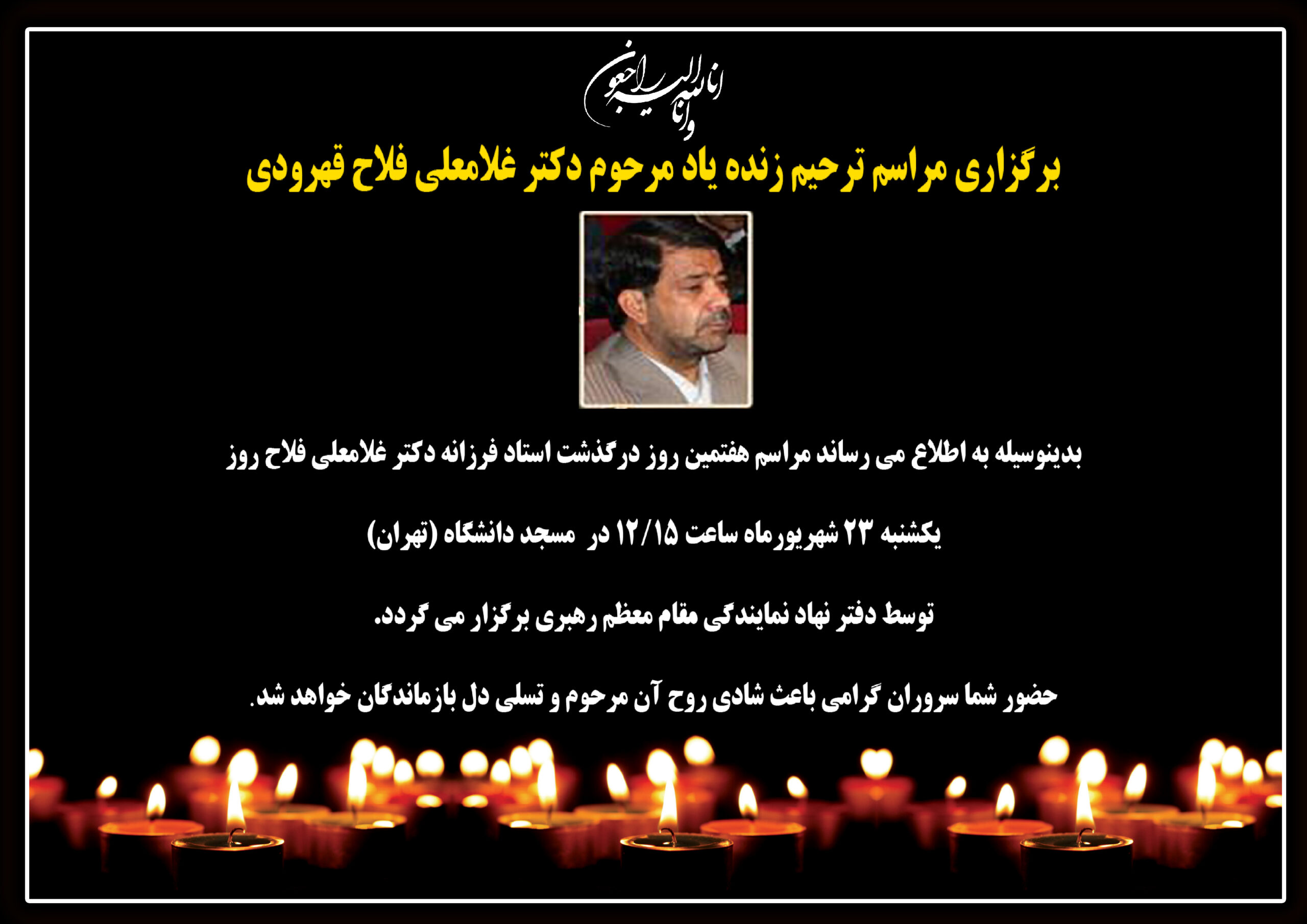 برگزاری مراسم هفتم زنده یاد مرحوم دکتر غلامعلی فلاح قهرودی 22 شهریور 1399اخبار نهاد رهبری واحد تهران, اطلاعیه هابدون دیدگاهنهاد رهبری در دانشگاه خوارزمی