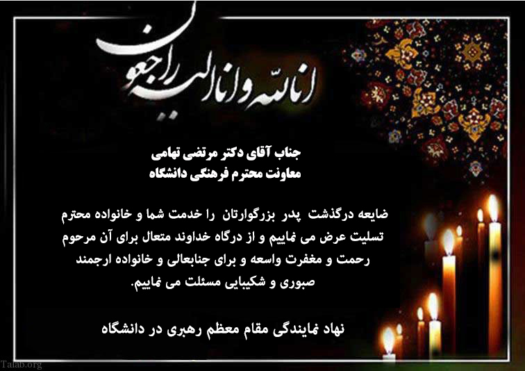 تسلیت به جناب آقای دکتر تهامی، معاونت محترم فرهنگی دانشگاه خوارزمی 11 اسفند 1399اخبار نهاد رهبریبدون دیدگاهنهاد رهبری در دانشگاه خوارزمی