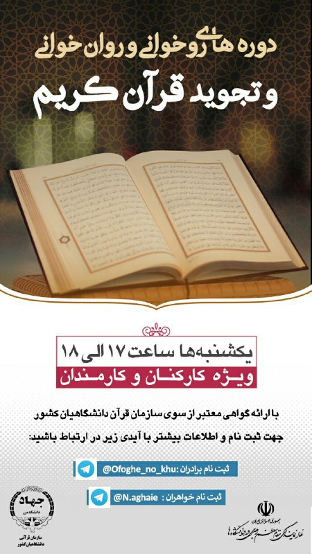 دوره مجازی آموزش روخوانی، روانخوانی و تجوید قرآن کریم ویژه کارکنان و کارمندان 23 مهر 1399اطلاعیه هابدون دیدگاهنهاد رهبری در دانشگاه خوارزمی