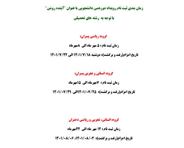 رویداد دورهمی دانشجویی با عنوان «آینده روشن» به همت نهاد نمایندگی مقام معظم رهبری در دانشگاهها، وزارت علوم- تحقیقات و فناوری و آستان قدس رضوی و با حضور رتبههای برتر کنکور سراسری در مهر و آبان ماه سال جاری جوار بارگاه ملکوتی حضرت ثامن الحجج، حضرت علی بن موسی الرضا(ع) با ویژه برنامههای فرهنگی-آموزشی برای دانشجویان برگزار می گردد.