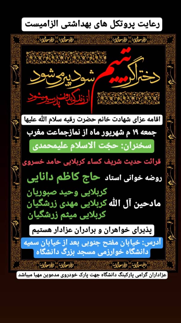 عزاداران گرامی جهت شرکت در این مراسم به آدرس : خیابان مفتح جنوبی، بعد از خیابان سمیه،