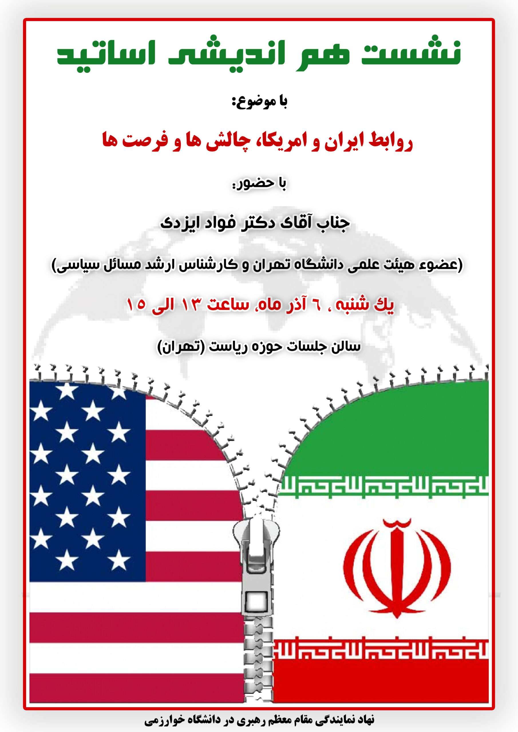 نشست هم اندیشی اساتید با موضوع: “روابط ایران و امریکا، چالش ها و فرصت ها” 01 آذر 1401اخبار نهاد رهبری واحد تهران, اطلاعیه هابدون دیدگاهنهاد رهبری در دانشگاه خوارزمی