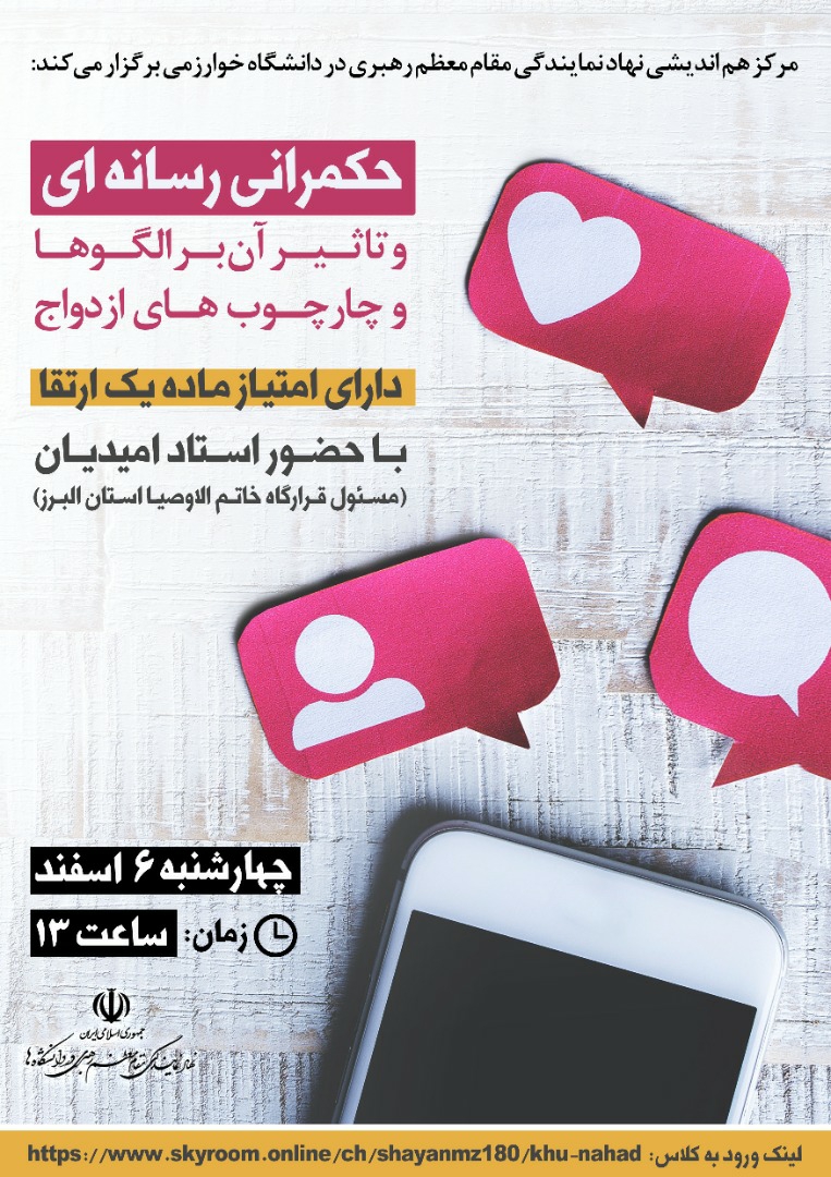 وبینار هم اندیشی اساتید (حکمرانی رسانه ای و تاثیر آن بر الگوها و چارچوب های ازدواج) 03 اسفند 1399اخبار نهاد رهبری واحد کرج, اطلاعیه هابدون دیدگاهنهاد رهبری در دانشگاه خوارزمی