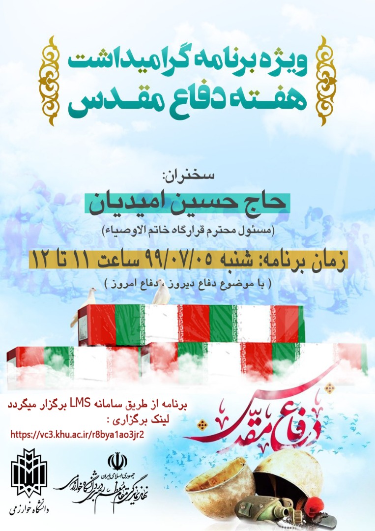 ویژه برنامه گرامیداشت هفته دفاع مقدس/ این برنامه با توجه به تقارن زمانی با جشنواره ملی حرکت به زمان دیگری موکول گردید 01 مهر 1399اخبار نهاد رهبری واحد کرج, اطلاعیه هابدون دیدگاهنهاد رهبری در دانشگاه خوارزمی