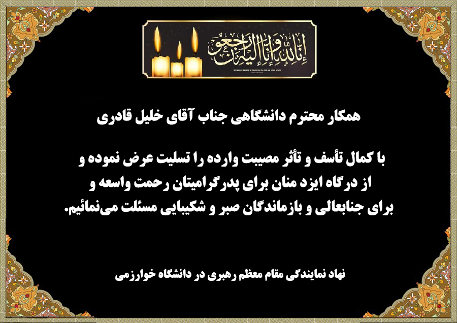 پیام تسلیت دفتر نهاد به همکاران دانشگاهی آقایان بهادرخانی و قادری 30 خرداد 1400اخبار نهاد رهبری واحد تهرانبدون دیدگاهنهاد رهبری در دانشگاه خوارزمی