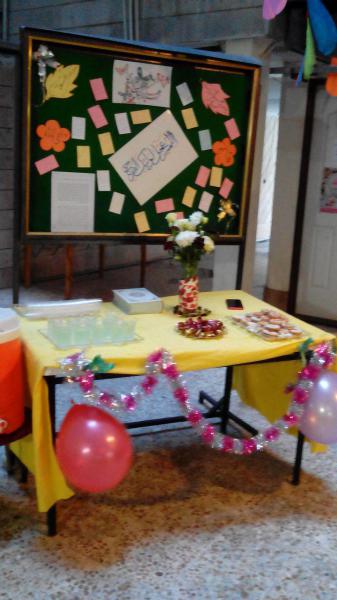 سالن همکف خوابگاه و نیز داخل نمازخانه با وسایل مختلف تزئینی و مطالب زیبایی که توسط یکی از دانشجویان اهل هنر خطاطی به نگارش درآمده بود … تزیین و فضاسازی گردید تا فضا هرچه بیشتر معنوی و فرح بخش باشد.