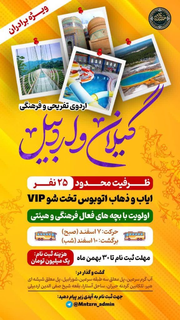 اردوی تفریحی و فرهنگی (ویژه برادران فعال فرهنگی و هیئتی)access_time 26 بهمن 1403comment بدون دیدگاهاردوی تفریحی و فرهنگی “گیلان و اردبیل” ویژه برادران فعال…